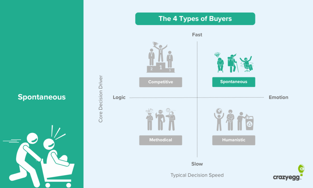 Spontaneous buyers are driven by emotion and excitement rather than logic. They want to feel good about their purchase and they want it now. As the Eisenbergs note, โthey are available, flexible, and engaged in a personal quest for action and impact, which defines who they are.โ