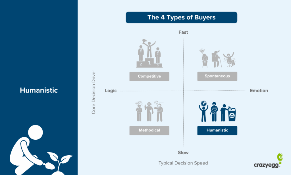 Humanistic buyers are driven by emotion, values, and human connection. They want to support businesses that align with their beliefs and contribute positively to the world. They research your company’s mission, values, and social impact.