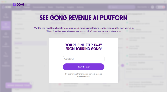 Once you click, you are brought directly to the Gong interface, which is blurred behind a headline, subhead, and signup box.