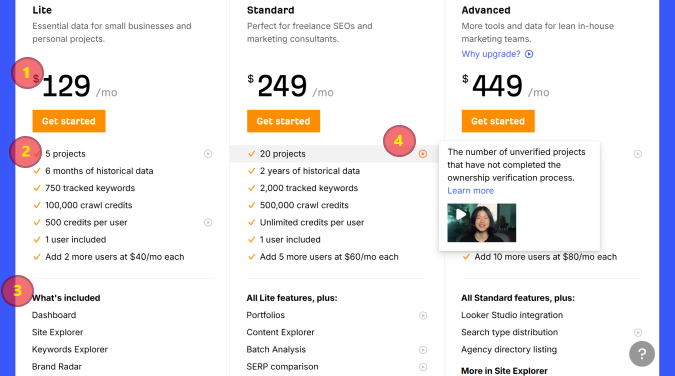 This is about as comprehensive of a SaaS pricing page as you are likely to see. You can answer almost any question you have about what a feature is, whether it’s included, and what the key limits are. Ahrefs makes it very easy to learn more and answer your own questions.
