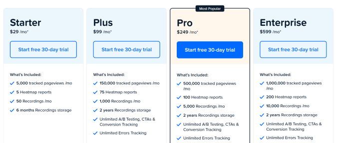 sat $29 per month and includes5 heatmap reports, 50 recordings, and up to 5K pageviews monthly.