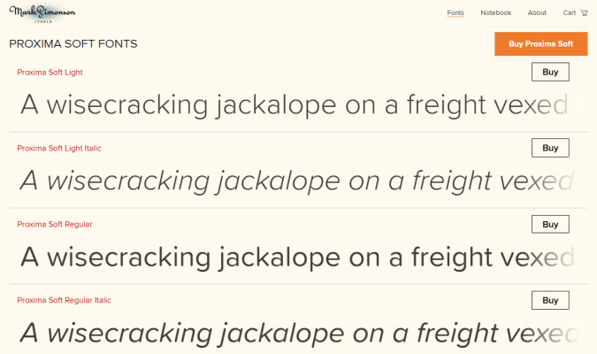 For example, Simonson sells Proxima Soft in three font families, which can each be purchased in a variety of styles (like: Thin, Regular, Bold, or Extra Bold Italic). Pictured below are samples of the different Proxima Soft families and styles.