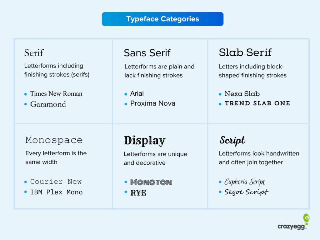 For each typeface category, weโll cover its main characteristics, where it is often used, and why.