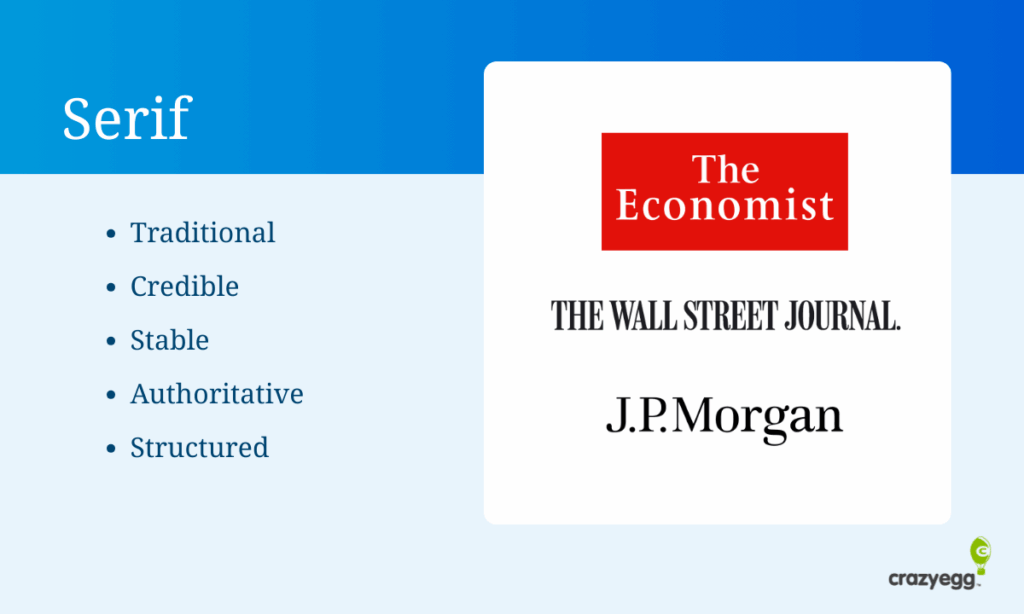 Serif typefaces use small finishing strokes or lines attached to the ends of the main stroke of the letterforms. These finishing strokes are known as serifs. From a font psychology perspective, these finishing strokes help create visual continuity between the letters and encourage the eye to move smoothly across the line.