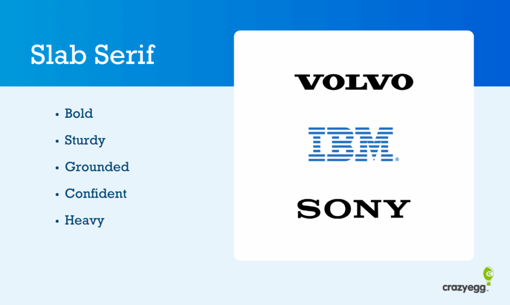 Slab serif typefaces use thick, block-like serifs that are similar in weight to the main strokes of the letterforms. Psychologically, this added weight gives the text a sturdy, grounded appearance that draws a lot of attention without feeling decorative or flashy.