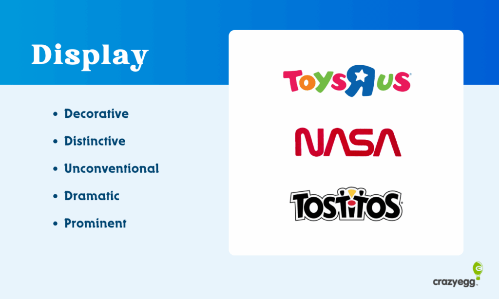 - Display fonts: A typeface that uses unique or decorative letterforms.