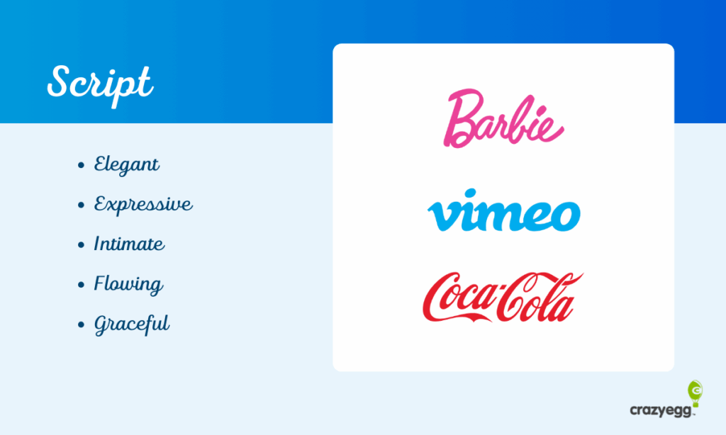 Script typefaces look like handwritten text, cursive, or calligraphy. They often have ligatures that connect letters and create a flowing, natural look. Because script fonts resemble handwriting, it introduces a much more human feel to the text.