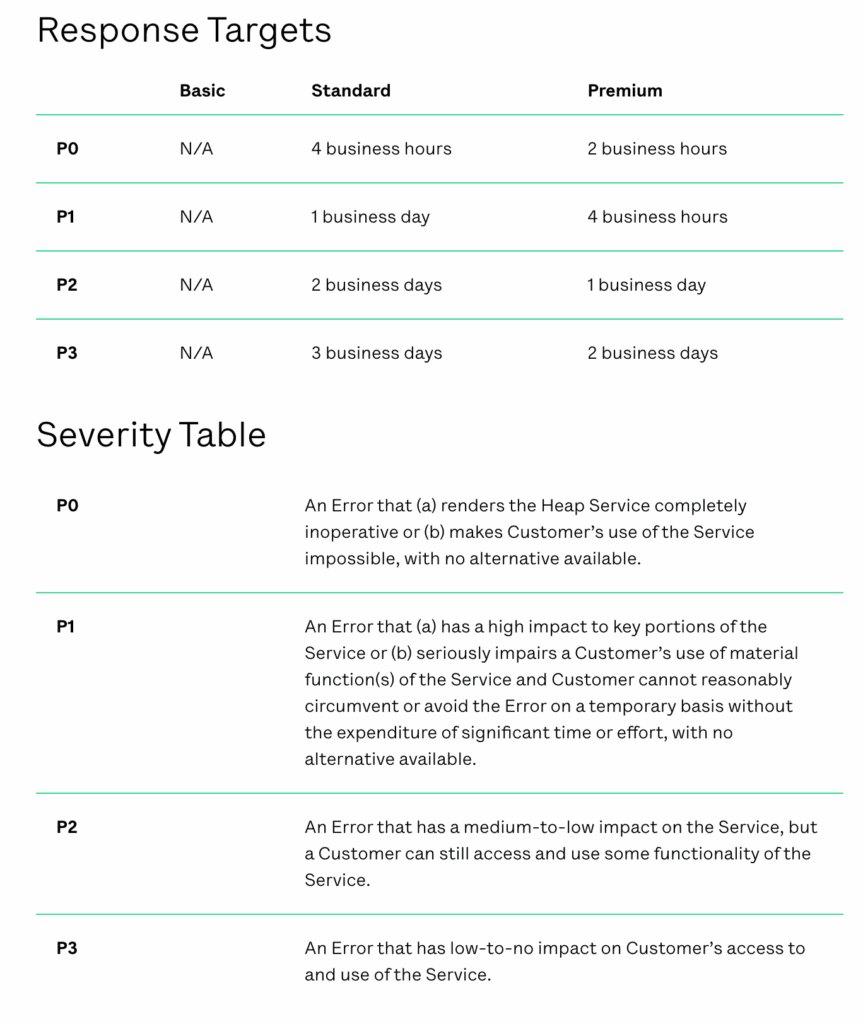 - Limited support for lower plan tiers. If you use Heap’s free version or pay for the base plan, you only get email support in the 9 AM – 5 PM EST time zone. The Standard plan gets you a few more time zones for sending and receiving emails, but phone support is still not available unless you pay extra for a professional services add-on.