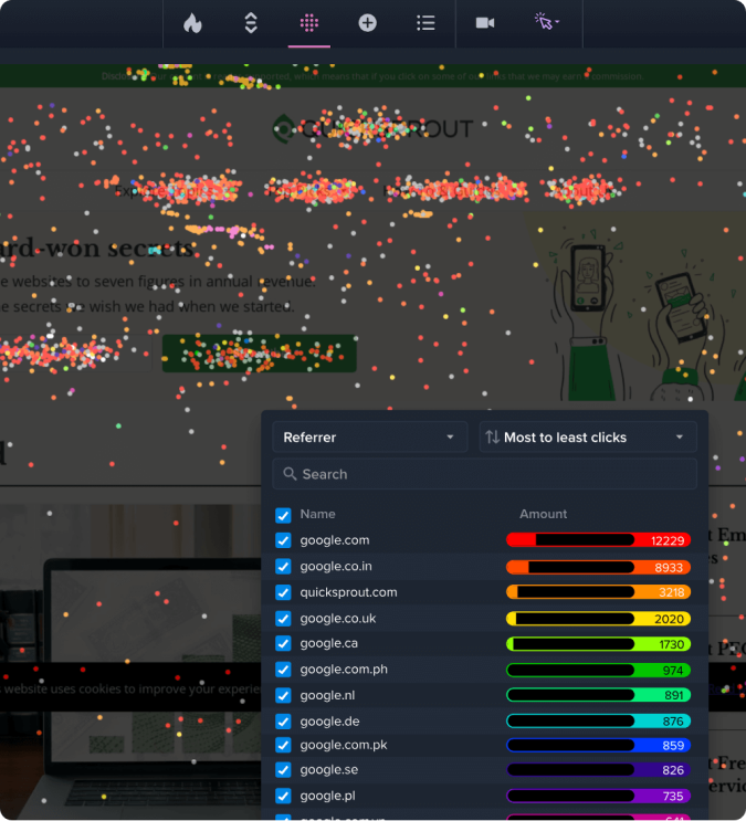 Pictured above is a click map in Crazy Egg (known as the Confetti Report), and you can see how each click has been tied to a specific referrer.