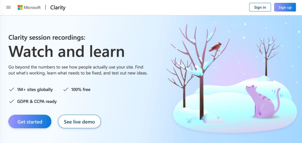 Microsoft Clarity is a free website behavior analytics tool that offers session recordings and heatmaps.