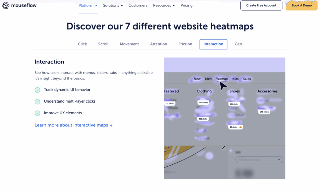 - Interaction heatmaps that give you a visual of users’ interactions with elements like menus, sliders, and tabs.