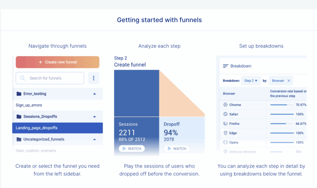 If there’s a snag in the funnel, it’s easy to study the recordings connected to that snag. You can see exactly what is causing people to abandon ship.