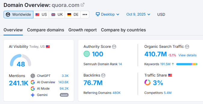 The most important factor, at least in the current moment, is that Quora is one of the most-cited domains in Googleโs AI Overviews, meaning your content can show up not just on Quora, but in AI-generated answers across Google, Bing, ChatGPT, and Perplexity.