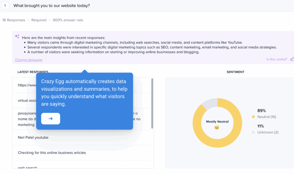 - Excellent blend of qualitative and quantitative tools. Crazy Egg offers unlimited, free surveys with its powerful Surveys tool, along with impressive A/B testing features. With Surveys, you can collect net promoter score (NPS) ratings, open-ended feedback, and even support tickets directly from your website. The A/B testing tool allows you to create split tests using existing URLs or by creating variants with an easy visual editor. Crazy Eggโs AI summaries help you absorb the key information in surveys and test results quickly.ย